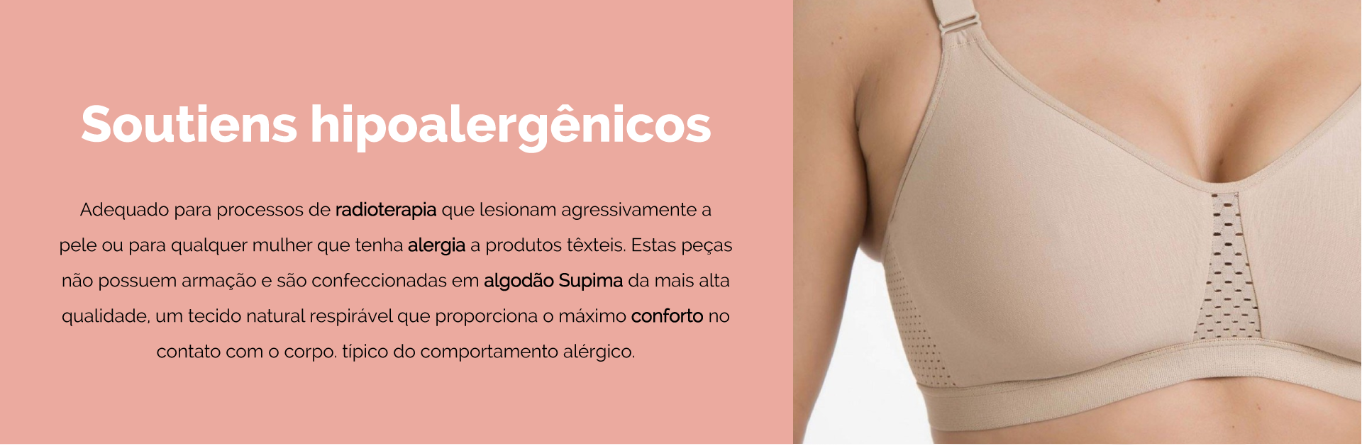 Soutien de algodão hipoalergénico sem aros. Desenvolvido a pensar nos processos de radioterapia ou para peles sensíveis a qualquer elemento sintético que em contacto com a pele deixa marcas propias de um...